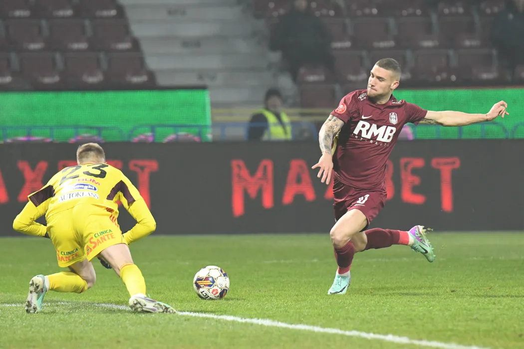 George Daniel Bîrligea și Plamen Ivanov Iliev în meciul de fotbal dintre FC CFR 1907 Cluj SA si AS FC Universitatea Cluj, contând pentru Superliga Superbet, desfășurat pe Stadionul Dr.Constantin Rădulescu din Cluj-Napoca, joi 21 decembrie 2023. © FOTO: Flaviu BUBOI/SPORT PICTURES