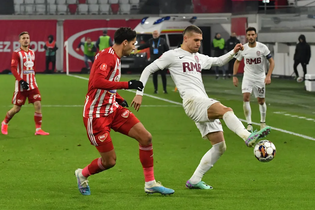George Daniel Bîrligea și Akos Kecskes în meciul de fotbal dintre FC Sepsi OSK Sfantu Gheorghe și FC CFR 1907 Cluj SA, contând pentru SuperLiga Superbet, desfășurat pe Stadionul SEPSI Arena OSK din Sfântu Gheorghe, duminică 17 decembrie 2023. © FOTO: Bogdan BALAS/SPORT PICTURES
