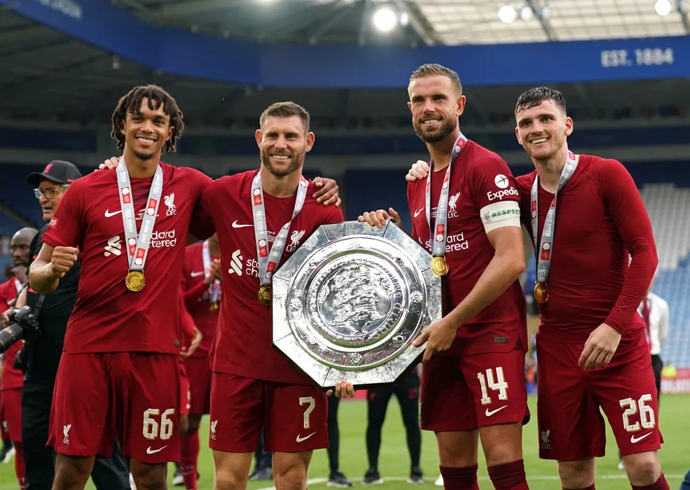 Liverpool's Trent Alexander Arnold, James Milner, Andrew Robertson and Jordan Henderson lift the trophy following the FA Community Shield match at the King Power Stadium, Leicester. Picture date: Saturday July 30, 2022.,Image: 710873915, License: Rights-managed, Restrictions: EDITORIAL USE ONLY No use with unauthorised audio, video, data, fixture lists, club/league logos or "live" services. Online in-match use limited to 120 images, no video emulation. No use in betting, games or single club/league/player publications., Model Release: no