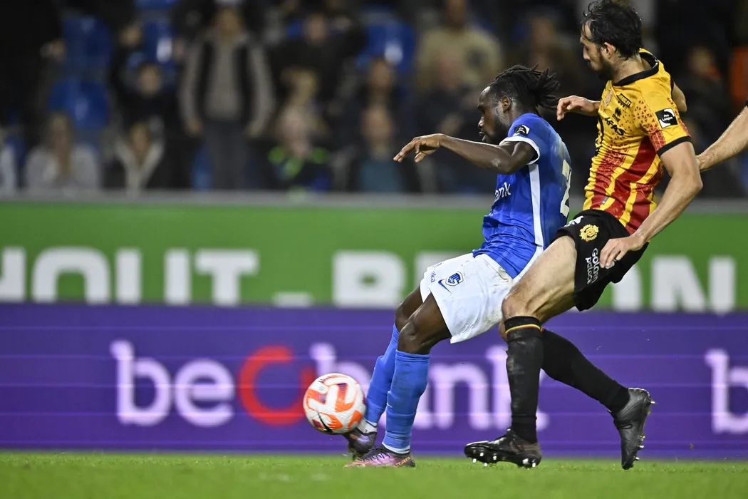 October 28, 2022, GENK, BELGIUM: Genk's Joseph Paintsil and Mechelen's Thibaut Peyre fight for the ball during a soccer match between KRC Genk and KV Mechelen, Friday 28 October 2022 in Genk, on day 15 of the 2022-2023 'Jupiler Pro League' first division of the Belgian championship.,Image: 733761681, License: Rights-managed, Restrictions: * Belgium, France, Germany, Luxembourg and Netherlands Rights OUT *, Model Release: no