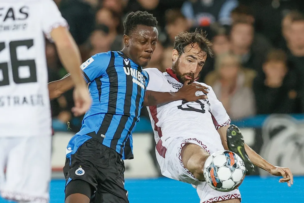 Club's Kamal Sowah and Mechelen's Thibaut Peyre fight for the ball during a soccer match between Club Brugge KV and KV Mechelen, Saturday 01 October 2022 in Brugge, on day 10 of the 2022-2023 'Jupiler Pro League' first division of the Belgian championship. BELGA PHOTO BRUNO FAHY,Image: 727461778, License: Rights-managed, Restrictions: World Rights Except Belgium and France * BELOUT FRAOUT, Model Release: no
