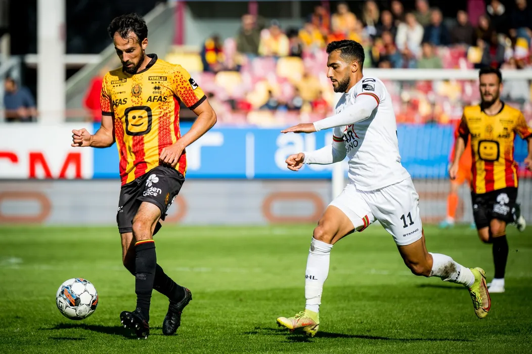 Mechelen's Thibaut Peyre and OHL's Mousa Suleiman Tamari fight for the ball during a soccer match between KV Mechelen and OH Leuven, Saturday 17 September 2022 in Mechelen, on day 9 of the 2022-2023 'Jupiler Pro League' first division of the Belgian championship.