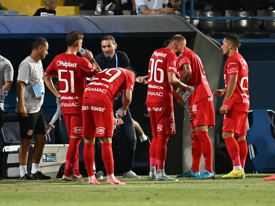 Fotbalistii sibieni alaturi de antrenorul lor Marius Măldărașanu la o pauza de hidratare luata la meciul de fotbal dintre Farul Constanta si FC Hermannstadt, contand pentru Superliga Superbet, desfasurat pe Stadionul central al Academiei Gheorghe Hagi din Ovidiu, luni 19 august 2024. © FOTO:Razvan Pasarica/SPORT PICTURES
