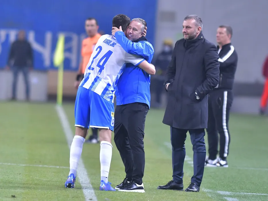 Laurențiu Reghecampf îl felicită pe Ante Roguljc pentru prima sa reușită în tricoul Universității Craiova. Sursă foto: SportPictures