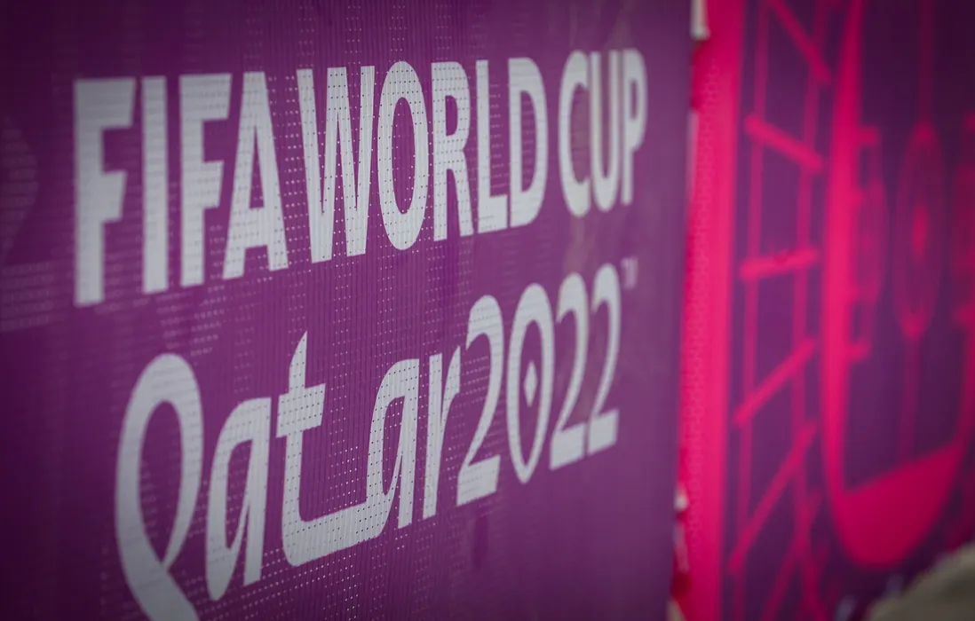A banner hangs outside the Ahmad bin Ali Stadium in Al Rayyan in the State of Qatar on Saturday 19 November 2022, where Belgian national soccer team the Red Devils will play Canada on Wednesday. The Red Devils are preparing for the upcoming FIFA 2022 World Cup in Qatar.