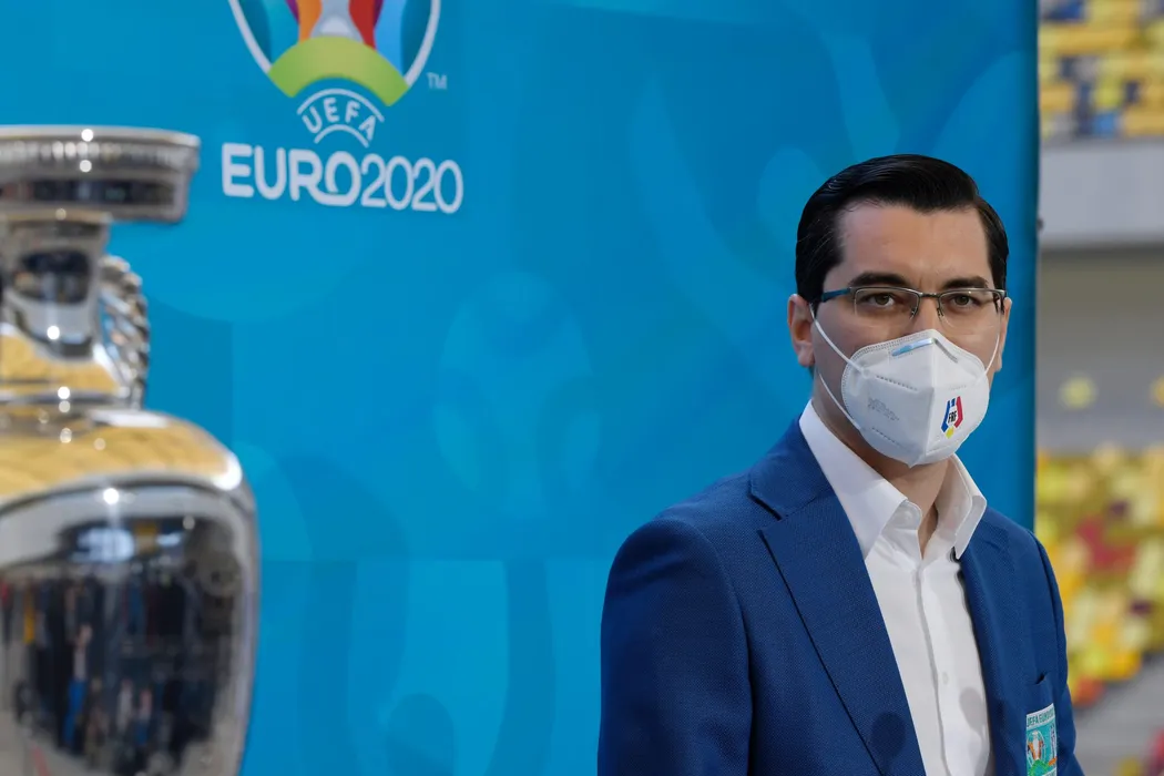 Razvan Burleanu, presedinte FRF, sustine un discurs in cadrul unui eveniment in care este prezentat trofeul UEFA EURO 2020, la Arena Nationala din Capitala, duminica, 25 aprilie 2021. Bucurestiul va gazdui, in cadrul UEFA EURO 2020, patru partide, trei din grupa C si o optime de finala. ANDREEA ALEXANDRU / MEDIAFAX FOTO