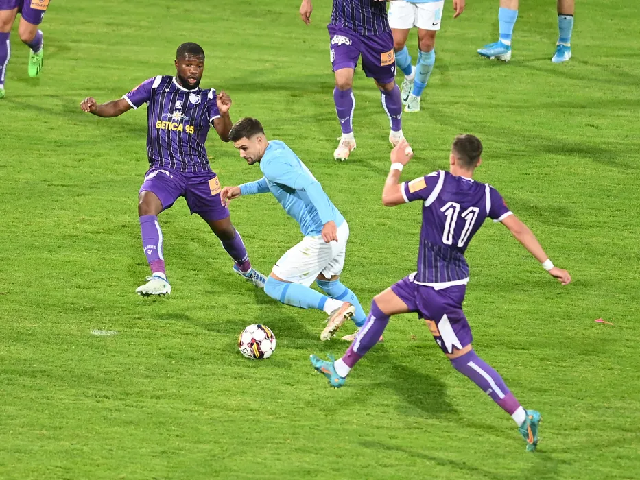 Tony Wilfried Nyandjou Njike si Vitalie Damascan in meciul de fotbal dintre FC Arges si FC Voluntari, contand pentru Superliga Superbet, desfasurat pe Stadionul Nicolae Dobrin din Pitesti, vineri 14 octombrie 2022. © FOTO:Razvan Pasarica/SPORT PICTURES
