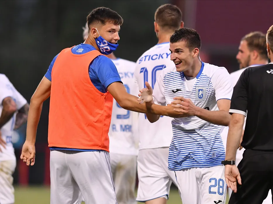 Bucurie craioveana cu Luis Emanuel Nitu si Mihai Valentin Mihaila in meciul de fotbal dintre CFR Cluj si Universitatea Craiova, contand pentru play-off-ul Ligii 1 Casa Pariurilor, disputat pe Stadionul Dr. Constantin Radulescu din Cluj Napoca, duminica 28 iunie 2020. © FOTO:Razvan Pasarica/SPORT PICTURES