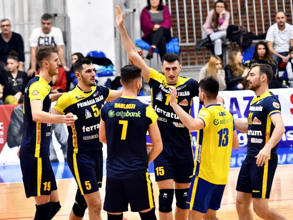 Bucurie a voleibalistilor din Zalau dupa un punct castigat in meciul de volei masculin dintre Steaua Bucuresti si ACS Volei Municipal Zalau, din cadrul Cupei Romaniei, desfasurat in Sala Regimentului de Garda Mihai Viteazul-Steaua din Bucuresti, duminica 22 decembrie 2019. © FOTO:Razvan Pasarica/SPORT PICTURES