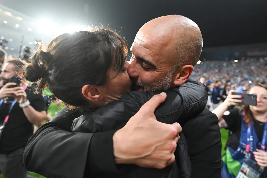 10 June 2023, Turkey, Istanbul: Soccer: Champions League, Manchester City - Inter Milan, knockout round, final, at the Ataturk Olympic Stadium. Manchester's coach Pep Guardiola kisses his wife Cristina after the match. Manchester wins 1:0.,Image: 782653324, License: Rights-managed, Restrictions: , Model Release: no
