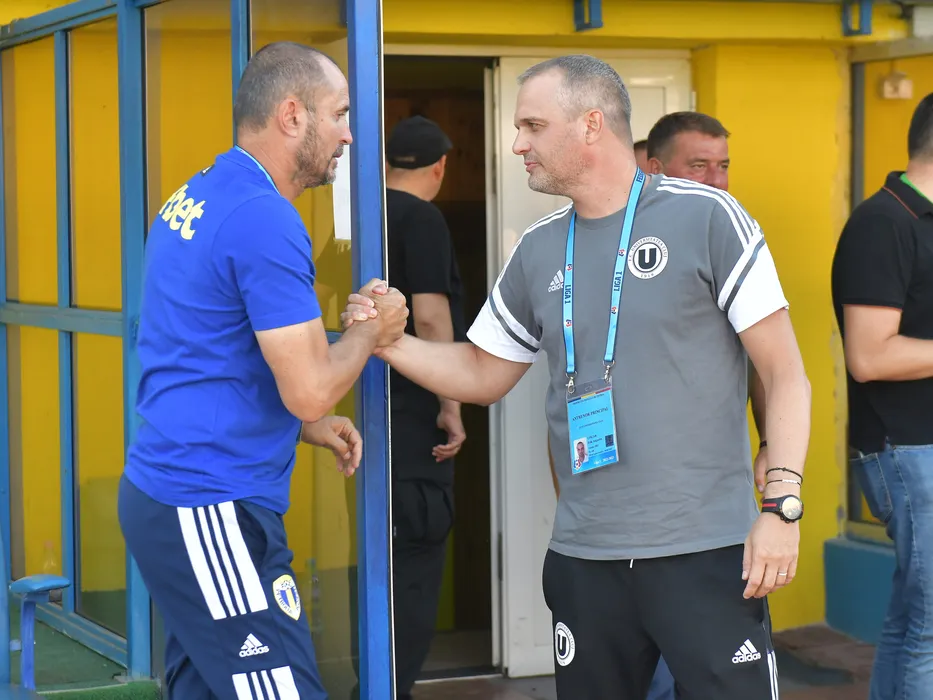 Cei doi antrenori Nicolae Constantin si Erik Augustin Lincar se saluta inaintea meciului de fotbal dintre Universitatea Cluj si Petrolul Ploiesti, contand pentru Superliga Superbet, desfasurat pe stadionul Municipal din Medias, vineri 5 august 2022. © FOTO:Razvan Pasarica/SPORT PICTURES