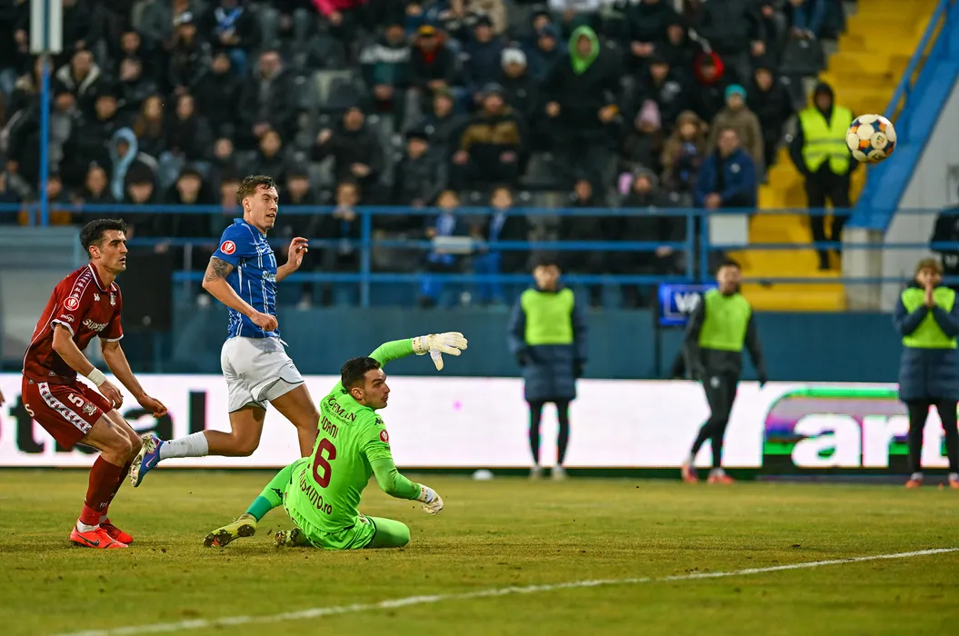 Mihai Alexandru Isfan suteaza de langa Alexandru Stefan Pascanu si inscrie in poarta aparata de Marian Mihai Aioani in meciul de fotbal dintre Farul Constanta si FC Rapid Bucuresti, contand pentru Superliga Superbet, desfasurat pe Stadionul Central al Academiei Gheorghe Hagi din Ovidiu, duminica 15 februarie 2026. © FOTO:Raed Krishan/SPORT PICTURES