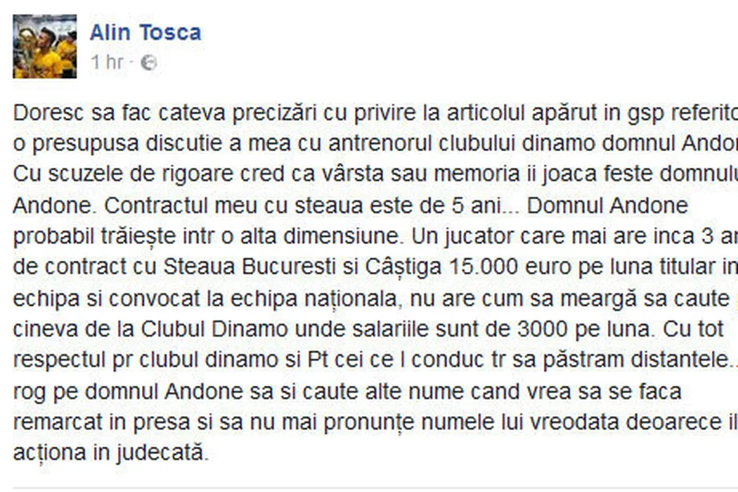 Replică acidă pe contul lui Toșca, după ce Andone a anunțat că a negociat cu Dinamo: „Trăiește în altă dimensiune! Cum să merg la Dinamo, unde salariile sunt de 3000 de euro?!” Cât câștigă fundașul la Steaua