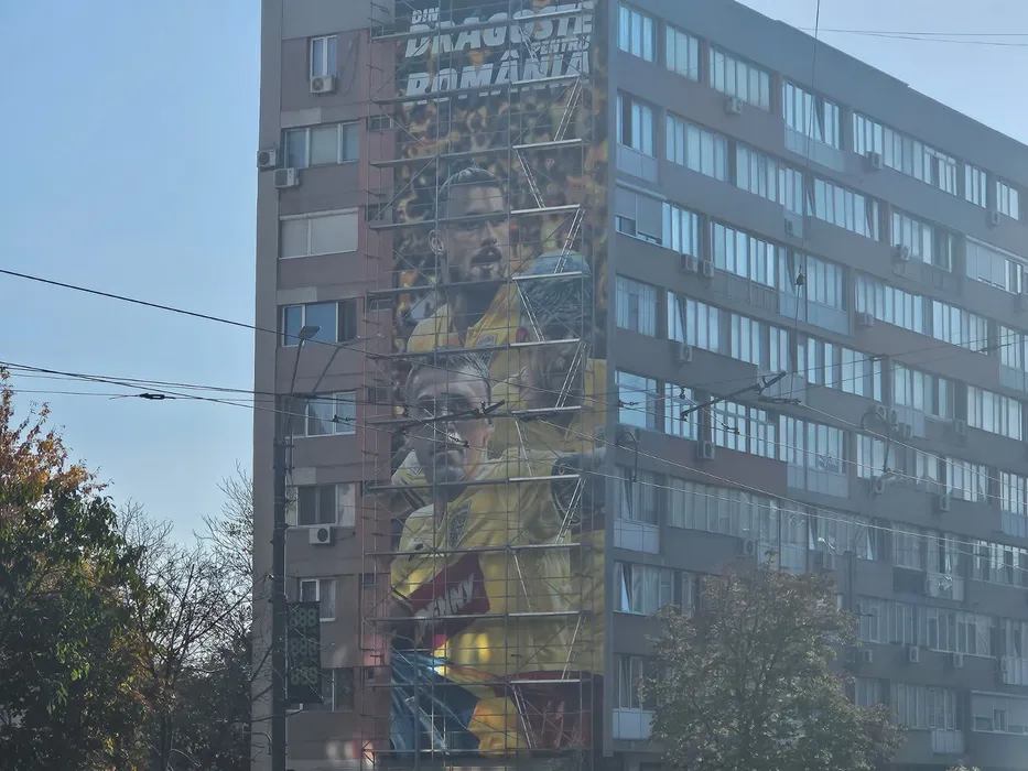 Reportaj la înălțime. Povestea muralului cât opt etaje în care apar Radu Drăgușin, Nicolae Stanciu și Andrei Rațiu: „Cine i-a pictat nici nu știe cine sunt. Oamenii sunt reticenți, apoi vin cu ciorbă și bere”. EXCLUSIV