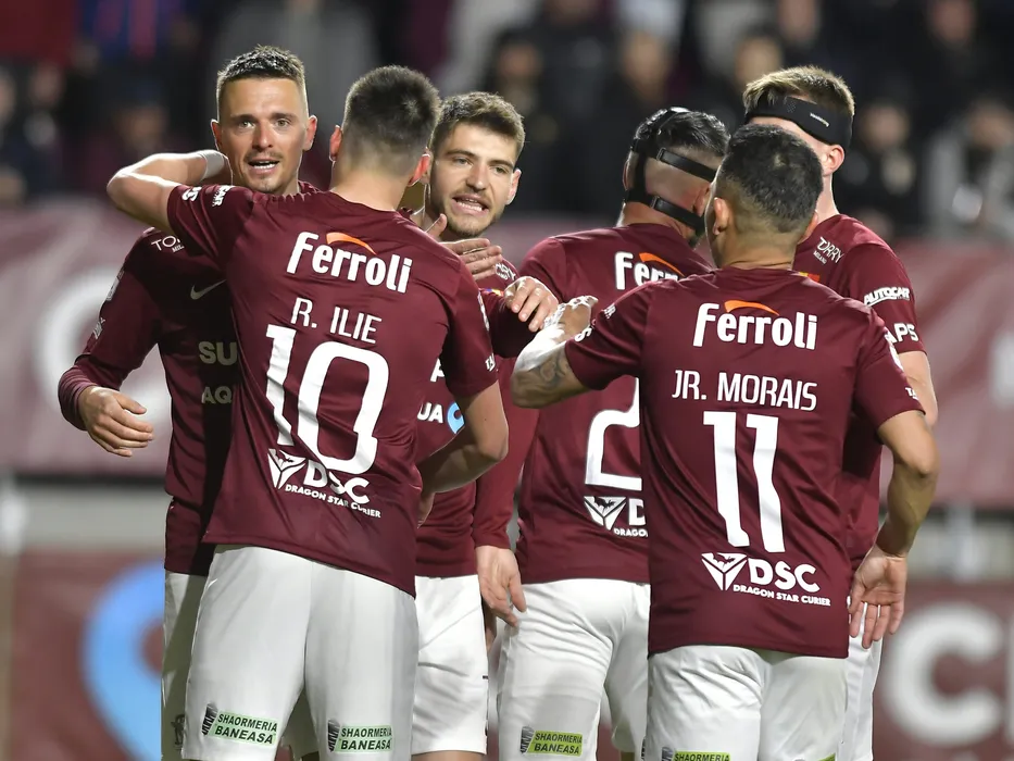 Bucurie a fotbalistilor rapidisti dupa un gol marcat cu Claudiu Belu Iordache si Jakub Vojtus in meciul de fotbal dintre Rapid Bucuresti si Gaz Metan Medias, contand pentru Play out-ul Ligii 1 Casa Pariurilor, desfasurat pe Stadionul Rapid-Giulesti din Bucuresti, luni 18 aprilie 2022. © FOTO:Razvan Pasarica/SPORT PICTURES