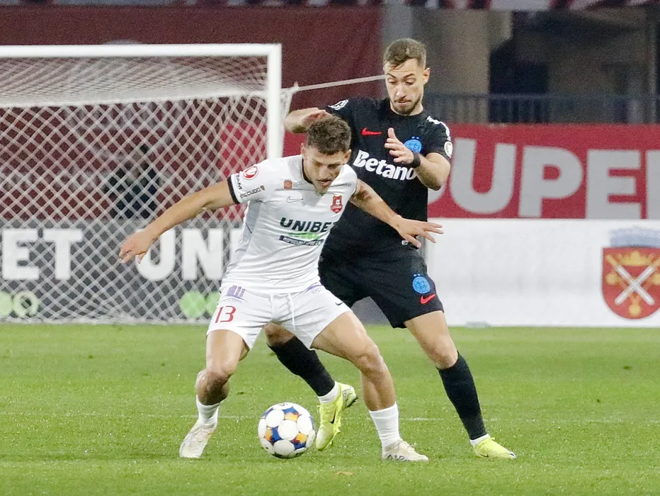 Constantin Dragos Albu si Mihai Daniel Lixandru in meciul de fotbal dintre AFC Hermannstadt Sibiu si FCSB, contand pentru Superliga Superbet, desfasurat pe Stadionul Municipal din Sibiu, duminica 9 noiembrie 2025. © FOTO:Valentin Macrea/SPORT PICTURES