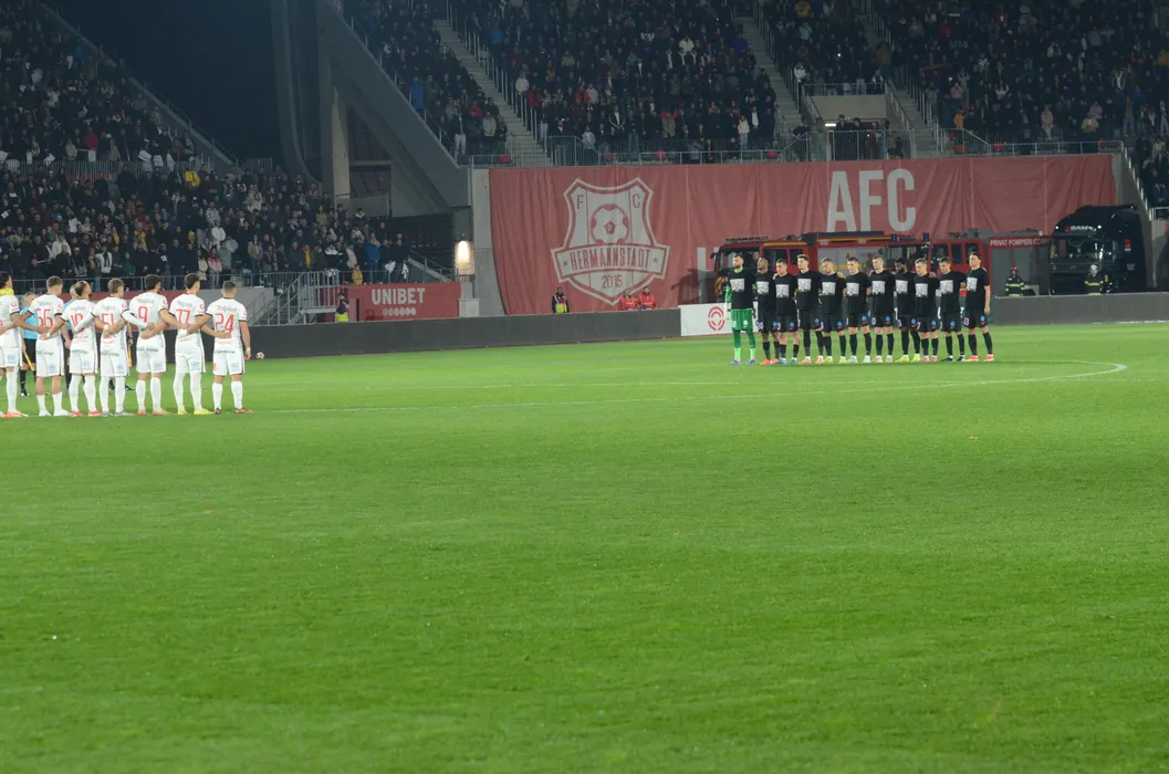 Fotbalistii celor doua echipe pastreaza un moment de reculegere inaintea meciului de fotbal dintre AFC Hermannstadt Sibiu si FCSB, contand pentru Superliga Superbet, desfasurat pe Stadionul Municipal din Sibiu, duminica 9 noiembrie 2025. © FOTO:Alexandra Cristina Grigorescu/SPORT PICTURES