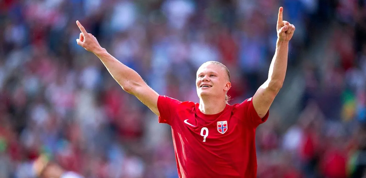 Norway's forward Erling Braut Haaland celebrates after scoring the 1-0 opening goal during the UEFA Euro 2024 group A qualification football match between Norway and Scotland in Oslo on June 17, 2023.,Image: 783961584, License: Rights-managed, Restrictions: Norway OUT, Model Release: no