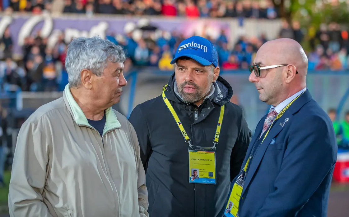 Mircea Lucescu, Florin Maxim și Anton Heleșteanu la startul meciului de fotbal dintre CS Corvinul 1921 Hunedoara și FC CFR 1907 Cluj, contând pentru Cupa României Betano - sferturi de finală, desfășurat pe Stadionul Michael Klein din Hunedoara, marți 2 aprilie 2024. © FOTO: Sebastian POPESCU/SPORT PICTURES