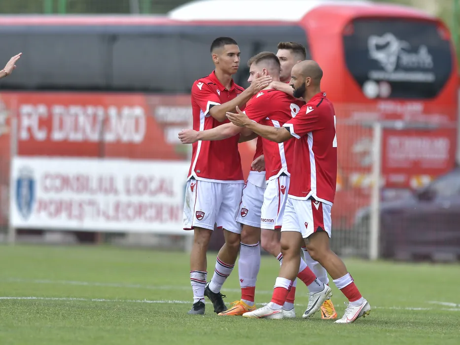 Valentin Lazar se bucura dupa un gol marcat alaturi de Deniz Giafer si Rodrigues De Moura in meciul amical de fotbal dintre CS Popesti Leordeni si Dinamo Bucuresti, desfasurat pe Stadionul Intergaz din Popesti Leordeni, miercuri 27 iulie 2022. © FOTO:Razvan Pasarica/SPORT PICTURES