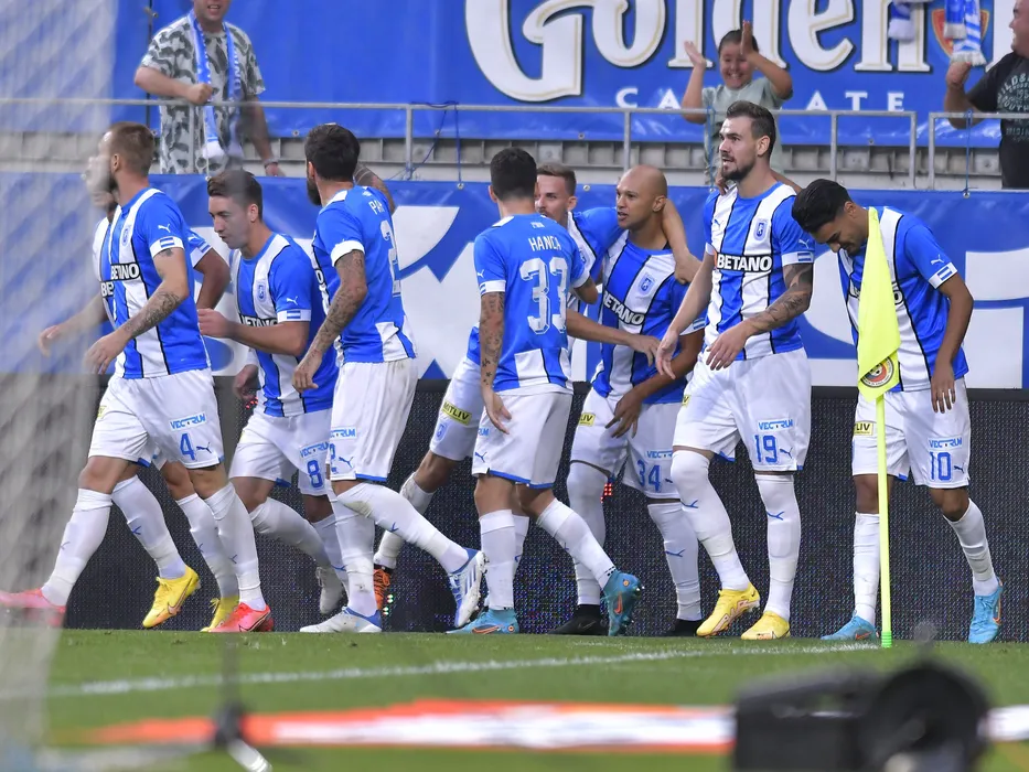 Bucurie a fotbalistilor craioveni Alexandru Mateiu, Nicusor Silviu Bancu, Raul Michel Melo Da Silva, Elvir Koljic si Stefan Baiaram dupa un gol marcat in meciul de fotbal dintre Universitatea Craiova si FC Zorya Luhansk, din cadrul UEFA Europa Conference League, desfasurat pe Stadionul Ion Oblemenco din Craiova, joi 11 august 2022. © FOTO:Razvan Pasarica/SPORT PICTURES