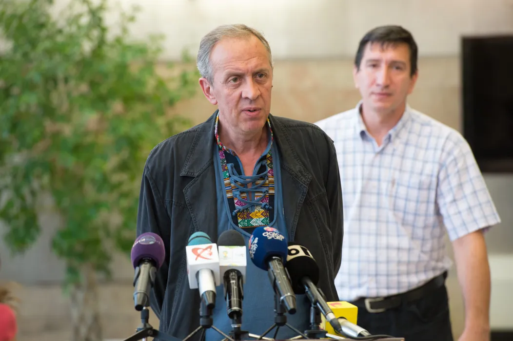 Octavian Zidaru, antrenorul lotului national de spada fete, sustine un discurs cu ocazia unei conferinte de presa, la Salonul Oficial al Aeroportului “Henri Coandă”, Otopeni, vineri, 13 iunie 2014. Echipa feminină de spadă a României, formată din Ana Maria Brânză, Simona Pop, Simona Gherman si Maria Udrea, a cucerit, joi, medalia de aur la Campionatele Europene de scrimă de la Strasbourg, după ce a învins, în finală, cu scorul de 38-34, reprezentativa Rusiei. VICTOR CIUPULIGA / MEDIAFAX FOTO