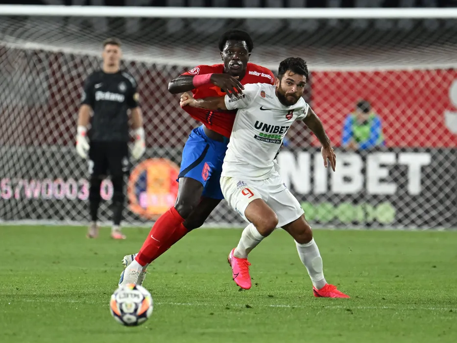 Joyskim Aurelien Dawa Tchakonte si Aurelian Ionuț Chițu in meciul de fotbal dintre FC Hermannstadt si FCSB, contand pentru Superliga Superbet, desfasurat pe Stadionul Municipal din Sibiu, duminica 25 august 2024. © FOTO:Razvan Pasarica/SPORT PICTURES
