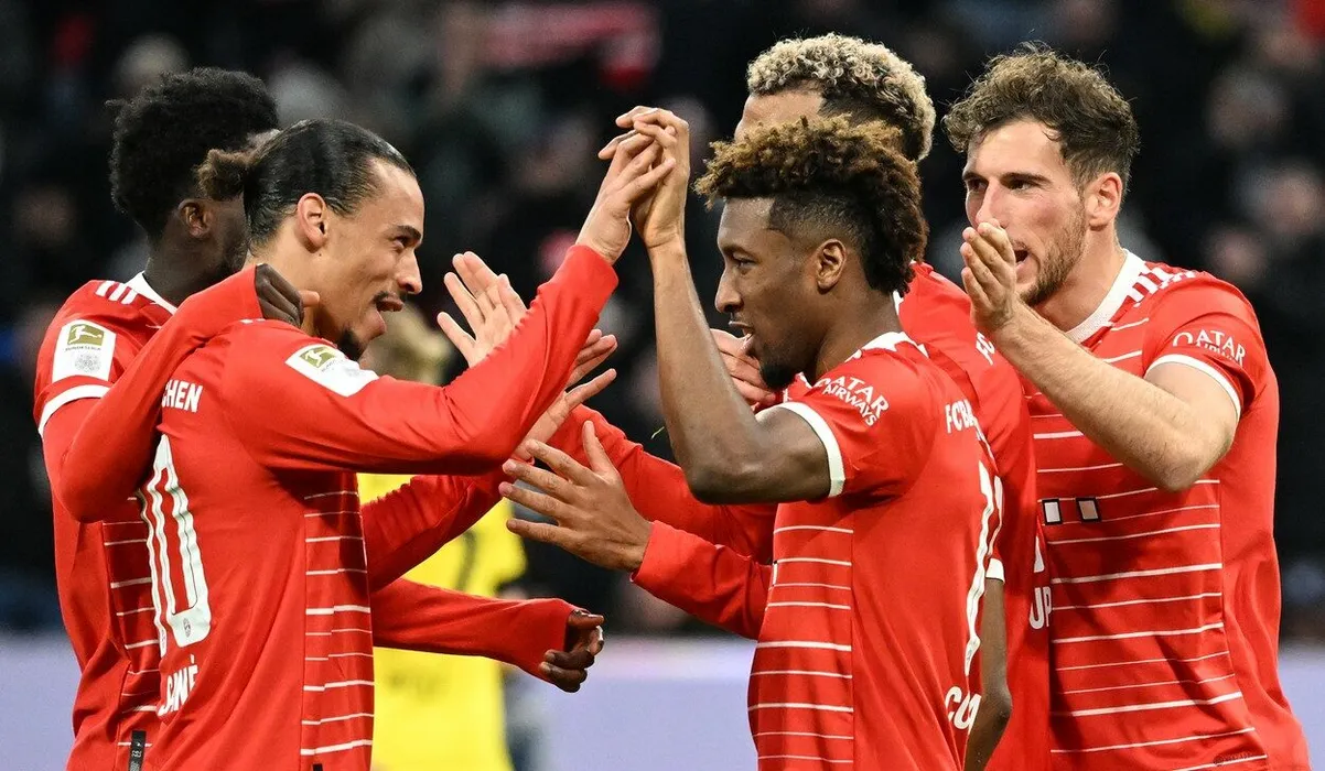 01 April 2023, Bavaria, Munich: Soccer: Bundesliga, Bayern Munich - Borussia Dortmund, Matchday 26, Allianz Arena, Bayern's Kingsley Coman (2vr) celebrates with teammates after his goal to make it 4-0. IMPORTANT NOTE: In accordance with the requirements of the DFL Deutsche Fußball Liga and the DFB Deutscher Fußball-Bund, it is prohibited to use or have used photographs taken in the stadium and/or of the match in the form of sequence pictures and/or video-like photo series.,Image: 766576168, License: Rights-managed, Restrictions: , Model Release: no