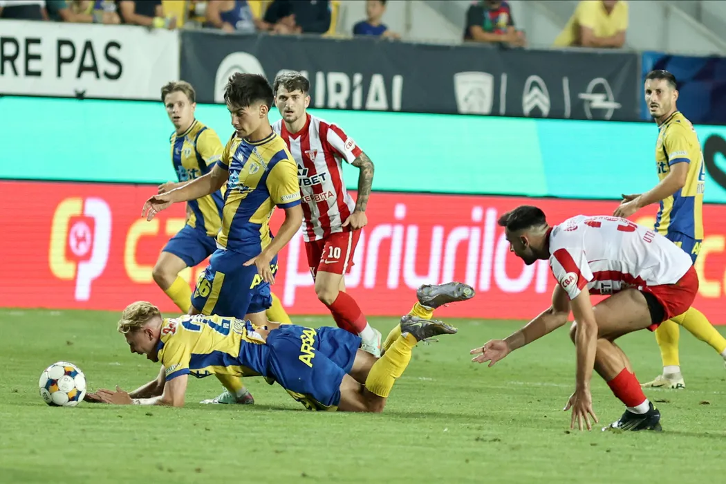 Alin Marius Botogan, Kilian Ludewig si Marinos Tzioni, Benjamin Andre P Van Durmen in meciul de fotbal dintre FC Petrolul Ploiesti si UTA Arad, contand pentru Superliga Superbet, desfasurat pe Stadionul Ilie Oana din Ploiesti, vineri 1 august 2025. © FOTO:Gheroghe Fluster/SPORT PICTURES