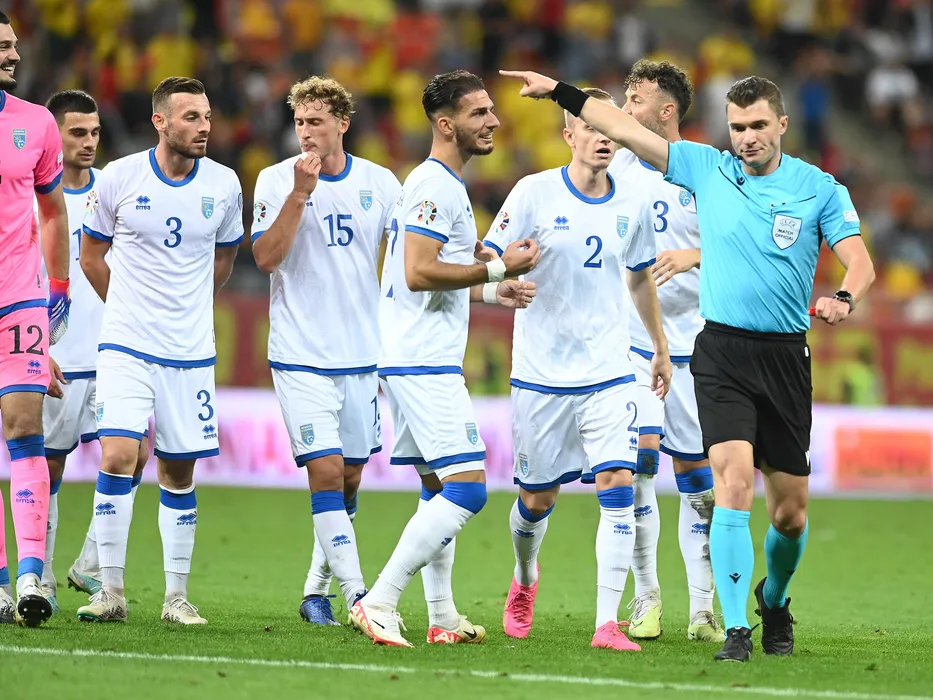 Arbitrul central Willy Delajod discuta cu fotbalistii kosovari Arijanet Muric,Fidan Aliti,Mergim Vojvoda si Fidan Aliti dupa dictarea unui penalty in meciul de fotbal dintre Romania si Kosovo, din cadrul preliminariilor Campionatului European 2024, desfasurat pe Arena Nationala, marti 12 septembrie 2023. © FOTO:Razvan Pasarica/SPORT PICTURES