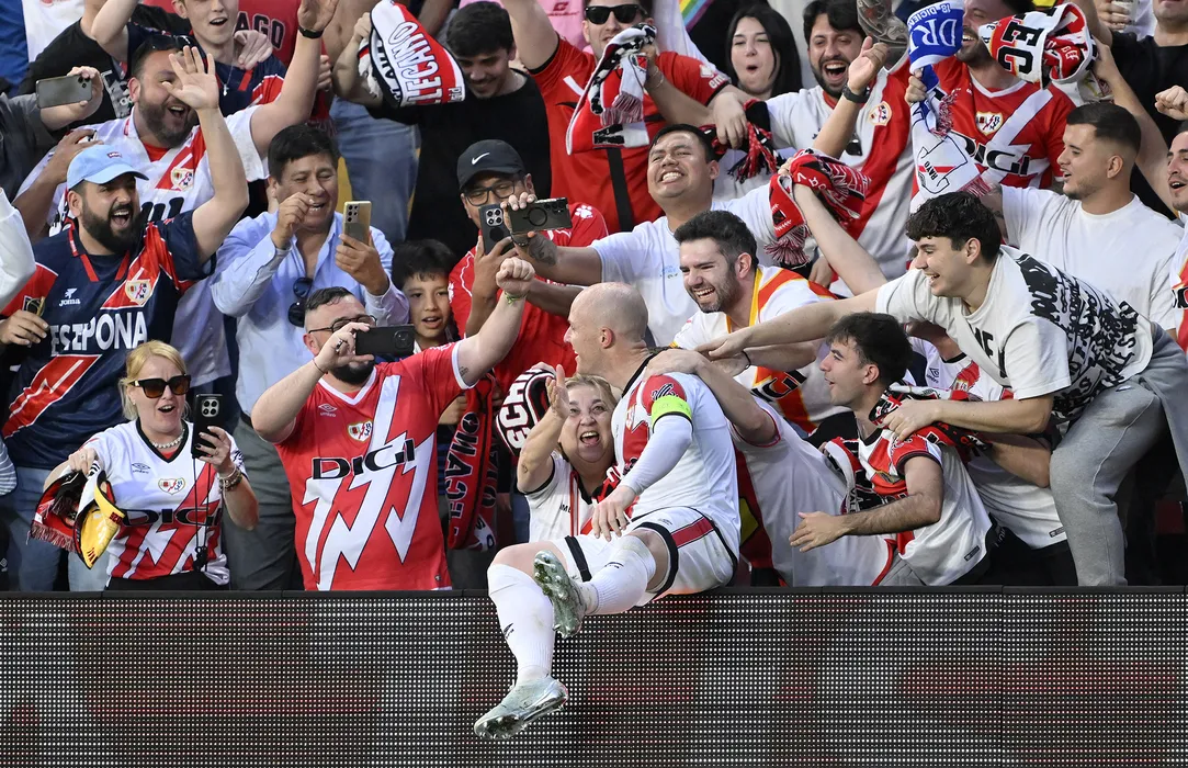 MADRID, SPAIN - APRIL 9: Isaac Palazon Camacho of Rayo Vallecano celebrates after scoring a goal during the UEFA Conference League 2025/26 Quarter-Final First Leg match between Rayo Vallecano and AEK Athens at Estadio de Vallecas on April 9, 2026 in Madrid, Spain. Burak Akbulut / Anadolu/ABACAPRESS.COM