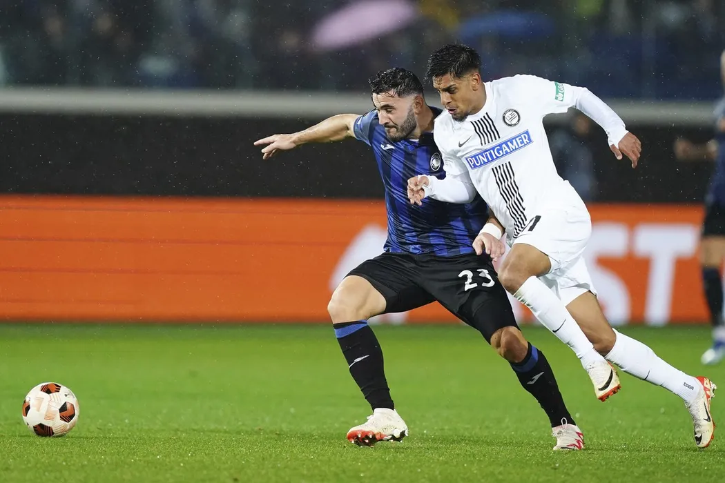 Atalanta's Sead Kolasinac, left, and Graz' Manprit Sarkaria, right, challenge for the ball during the Europa League Group D soccer match between Atalanta Bergamo and Sturm Graz in Bergamo, Italy, Thursday, Nov. 9, 2023.,Image: 820936505, License: Rights-managed, Restrictions: This content is intended for editorial use only. For other uses, additional clearances may be required.
