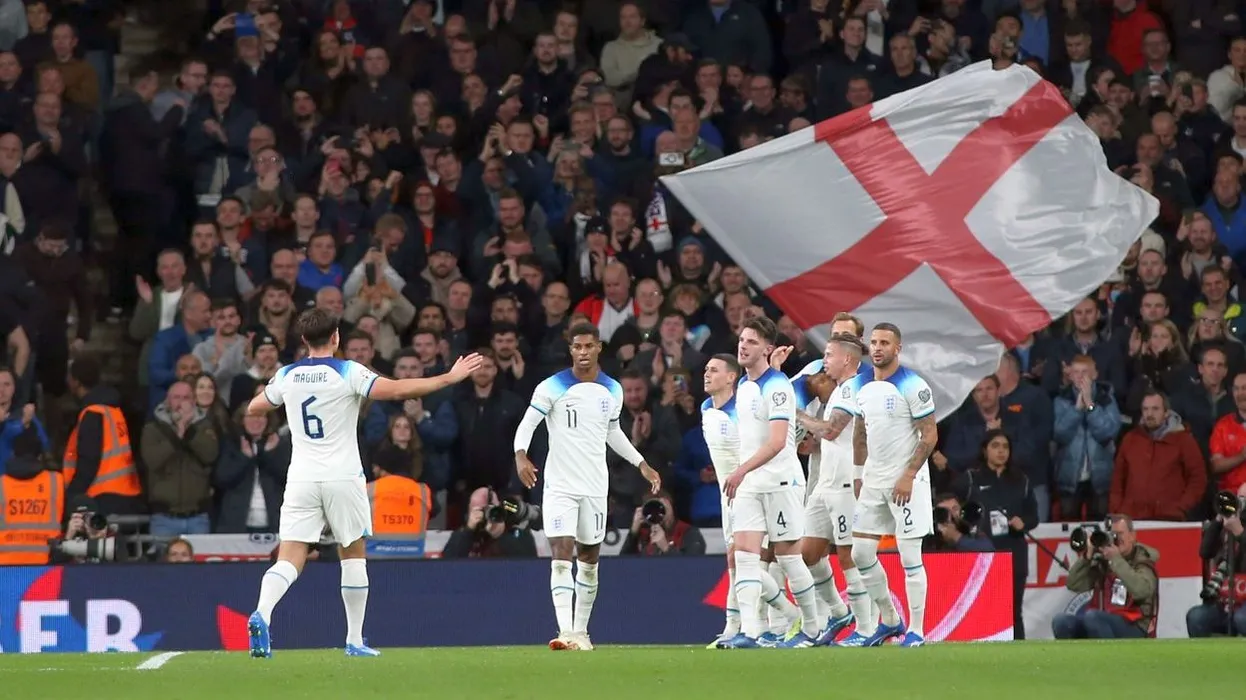 October 17, 2023, London, England, United Kingdom: London, October 17th 2023: Marcus Rashford of England celebrates after scoring a goal (2-1)during the UEFA Euro 2024 Qualifier football match between England and Italy at Wembley Stadium, London, England.,Image: 814506629, License: Rights-managed, Restrictions: * Brazil and Mexico Rights OUT *, Model Release: no