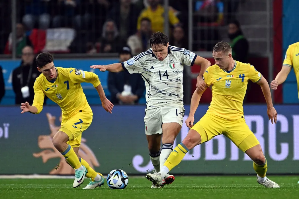 20 November 2023, North Rhine-Westphalia, Leverkusen: Soccer: European Championship qualifier, Ukraine - Italy, group stage, Group C, match day 10, in the BayArena. Ukraine's Oleksandr Svatok (r) and Italy's Federico Chiesa fight for the ball. Photo: Federico Gambarini/dpa,Image: 823306780, License: Rights-managed, Restrictions: GERMANY OUT, Model Release: no