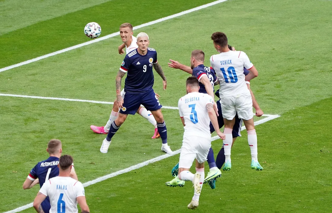 14 June 2021, United Kingdom, Glasgow: Czech Republic's Patrik Schick (R) scores his side's first goal during the UEFA EURO 2020 Group D soccer match between Scotland and the Czech Republic at Hampden Park. Photo: Jane Barlow/PA Wire/dpa