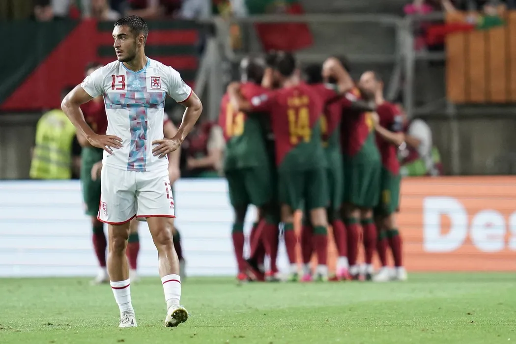 Fussball EM Qualifikation 2023 - 2024 11.09.2023, Fussball Länderspiel, Laenderspiel, EM Qualifikation, 2023/2024, Gruppe J, Spieltag 6, Portugal, Faro, Algarve, Portugal POR Luxemburg LUX vl: Dirk Carlson Luxemburg 13 ist enttaeuscht, ist frustriert, frust, zeigt Emotionen, is frustrated, shows emotions - hinten jubelt Portugal *** European Football Championship Qualification 2023 2024 11 09 2023, country match, country match, European Championship Qualification, 2023 2024, group J, matchday 6, Portugal, Faro, Algarve, Portugal POR Luxembourg LUX vl Dirk Carlson Luxembourg 13 is disappointed, is frustrated, frustration, shows emotions, is frustrated, shows emotions behind cheers Portugal,Image: 804615353, License: Rights-managed, Restrictions: PUBLICATIONxNOTxINxLUX, Credit images as "Profimedia/ IMAGO", Model Release: no