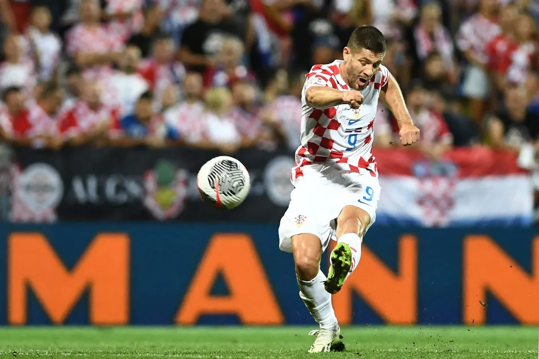 Croatia's forward #9 Andrej Kramaric shoots towards goal during the UEFA Euro 2024 football tournament group D qualification football match between Croatia and Latvia at the Rujevica Stadium in Rijeka, on September 08, 2023.,Image: 803841246, License: Rights-managed, Restrictions: , Model Release: no