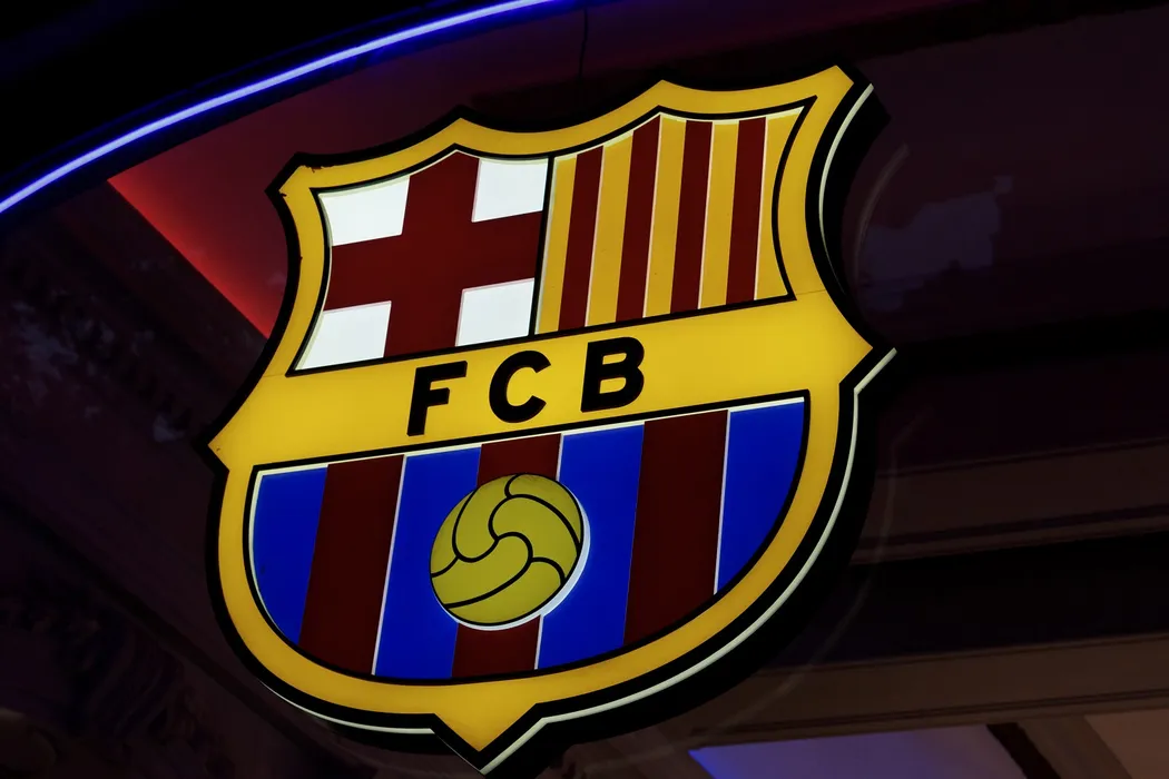 Barcelona football club logo in store. Official Store. Model Released Property Released xkwx soccer spain barcelona fc barcelona football team sports spanish store fc emblem catalonia league logo editorial sign europe official brand catalan illustrative icon champion flags european name blue winner identity fb businesses play banner fan economy support camp nou symbol clubs