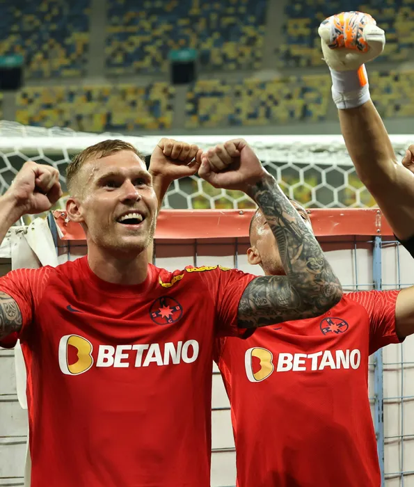 Stefan Tirnaveanu si Joonas Tamm in meciul de fotbal dintre FCSB si Saburtalo Tbilisi, contand pentru turul 2 preliminar al Conference League, desfasurat pe Arena Nationala din Bucuresti, joi 28 iulie 2022. © FOTO:Gheorghe Fluster/SPORT PICTURES