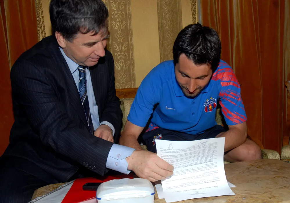 Adrian Neaga semneaza contractul cu Steaua Bucuresti sub privirile presedintelui Valeriu Argaseala (in stanga).