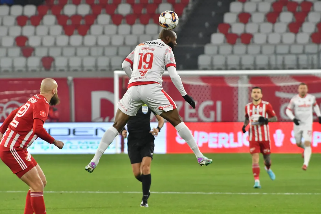 Hakim Djamel Abdallah și Branislav Ninaj în meciul de fotbal dintre FC Sepsi OSK Sfantu Gheorghe și SC Dinamo 1948 Bucuresti, contând pentru SuperLiga Superbet, desfășurat pe Stadionul SEPSI Arena OSK din Sfântu Gheorghe, luni 4 decembrie 2023. © FOTO: Bogdan BALAS/SPORT PICTURES