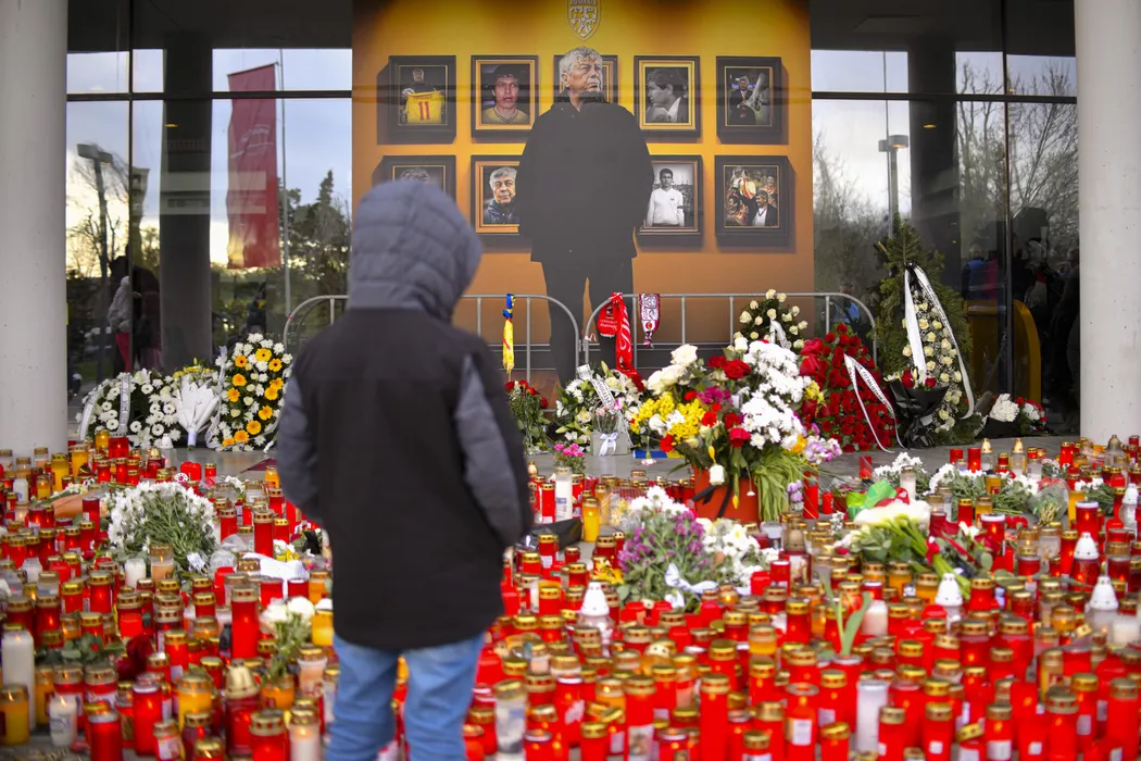 Un copil priveste o fotografie a fostului antrenor Mircea Lucescu, al carui sicriu a fost depus la Arena Nationala din Bucuresti, joi, 9 aprilie 2026. ALEXANDRU DOBRE / MEDIAFAX FOTO