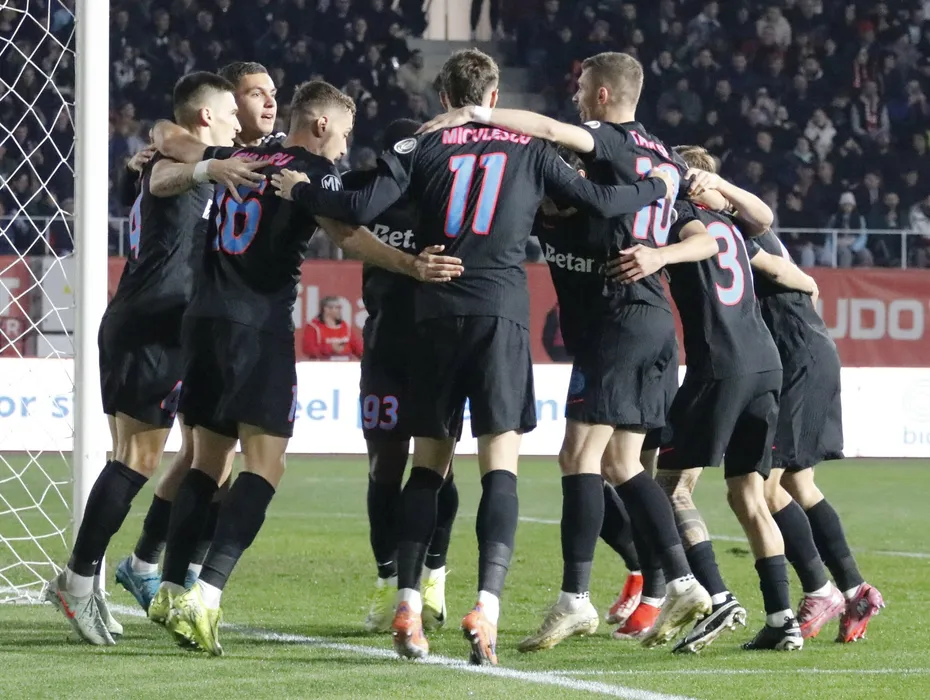 Fotbalistii ros-albastrii se bucura dupa un gol marcat in meciul de fotbal dintre AFC Hermannstadt Sibiu si FCSB, contand pentru Superliga Superbet, desfasurat pe Stadionul Municipal din Sibiu, duminica 9 noiembrie 2025. © FOTO:Valentin Macrea/SPORT PICTURES