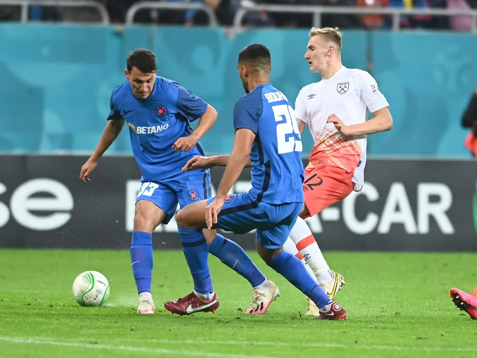 Risto Radunovic si Flynn Downes in meciul de fotbal dintre FCSB si West Ham United, din cadrul grupelor UEFA Europa Conference League, desfasurat pe Arena Nationala din Bucuresti, joi 3 noiembrie 2022. © FOTO:Razvan Pasarica/SPORT PICTURES