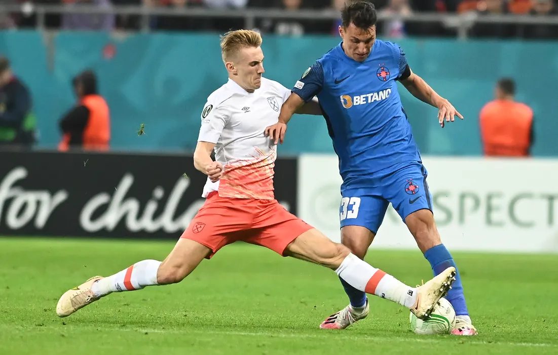 Flynn Downes si Risto Radunovic in meciul de fotbal dintre FCSB si West Ham United, din cadrul grupelor UEFA Europa Conference League, desfasurat pe Arena Nationala din Bucuresti, joi 3 noiembrie 2022. © FOTO:Razvan Pasarica/SPORT PICTURES