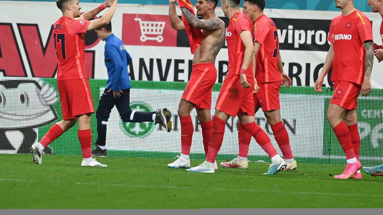 Florinel Teodor Coman se bucura dupa un gol marcat alaturi de Darius Dumitru Olaru, Adrian Gheorghe Sut, Risto Radunovic si David Raul Miculescu in meciul de fotbal dintre FCSB si CFR Cluj, contand pentru Play-off-ul Superligii Superbet, desfasurat pe Arena Nationala din Bucuresti, duminica 14 mai 2023. © FOTO:Razvan Pasarica/SPORT PICTURES