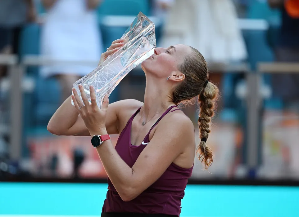 MIAMI GARDENS FL - APRIL 01: Petra Kvitova poses with the Championship Trophy after defeating Elena Rybakina during the Women's Finals at the 2023 Miami Open at Hard Rock Stadium on April 1, 2023 in Miami Gardens, Florida.,Image: 766704712, License: Rights-managed, Restrictions: **Not for sale in: USA, Brazil, Mexico**, Model Release: no