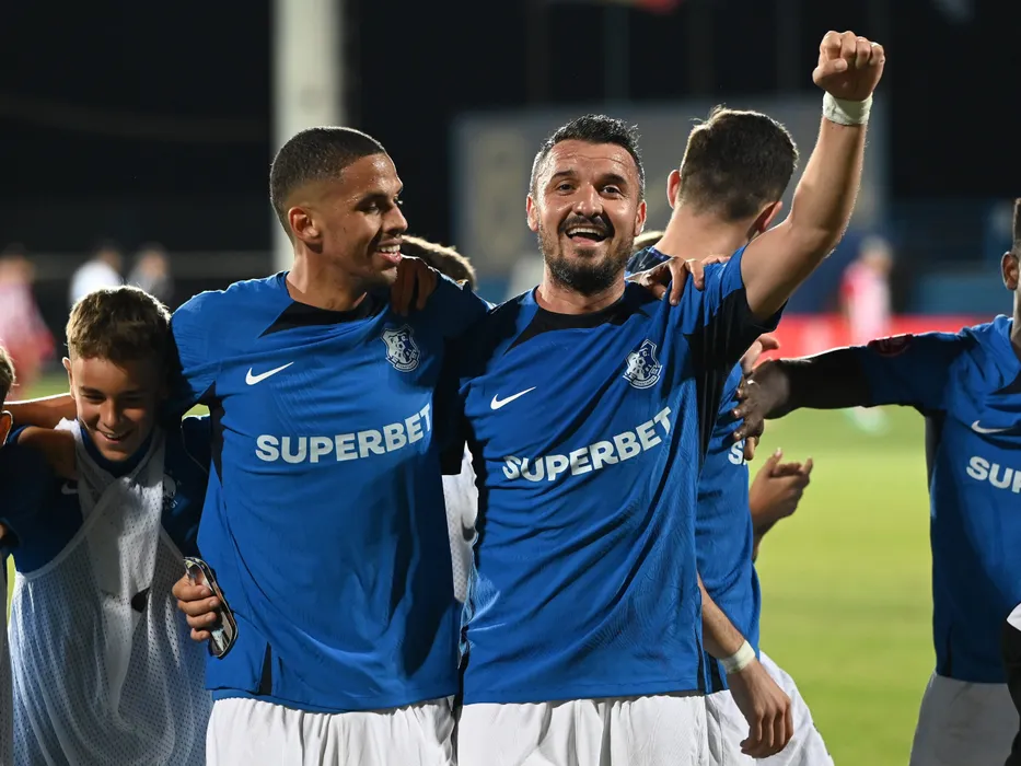 Constantin Valentin Budescu alaturi de Rivaldinho (Mosca Rivaldo Vitor Ferreira) saluta galeria dupa meciul de fotbal dintre Farul Constanta si Sepsi OSK Sfantu Gheorghe, contand pentru Superliga Superbet, desfasurat pe Stadionul central al Academiei Gheorghe Hagi din Ovidiu, sambata 30 septembrie 2023. © FOTO:Razvan Pasarica/SPORT PICTURES