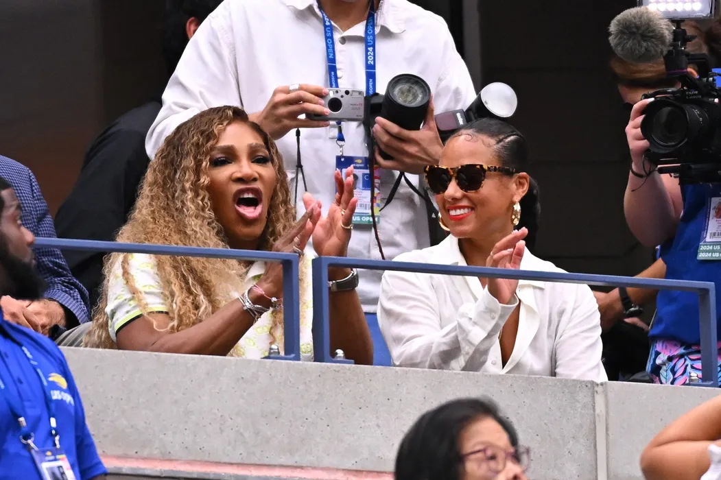 Former tennis champion Serena Williams (USA) and singer Alicia Keys supporting Grigor Dimitrov (BUL) during his fourth round match at the 2024 US Open at Billie Jean National Tennis Center in New York City, NY, USA, on September 1, 2024.,Image: 903997372, License: Rights-managed, Restrictions: , Model Release: no