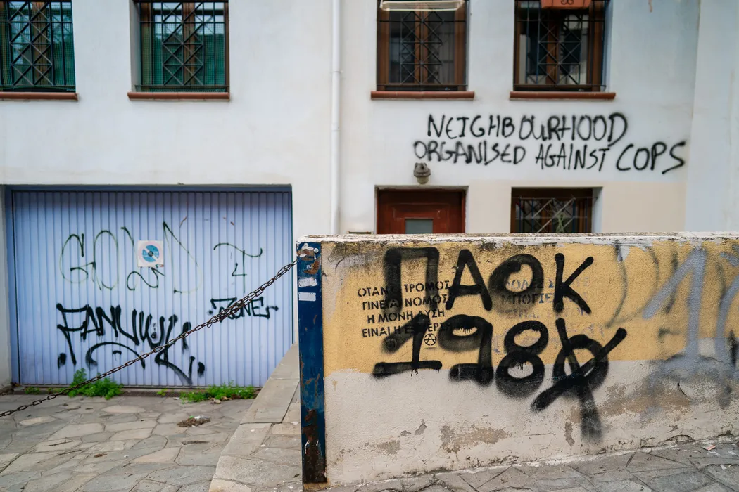 Rivalitatea dintre cele trei echipe din Salonic, descrisă în arta urbană de ultrașii greci. FOTO